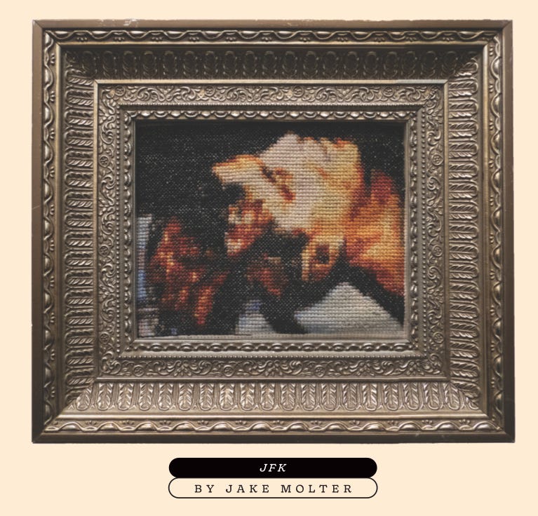 Our eighth print issue includes: our dead friends & their unfinished projects, JFK assassination cross-stitches, sperm donation centers in minor American cities, ill-advised campus romances, prima ballerinas with ankle monitors, online poker, and Sophie Madeline Dess’s decisive statement on her debut: “I’d rather die than have my parents read it.” Our cover and back cover are both oil paintings courtesy of Stella Winter.